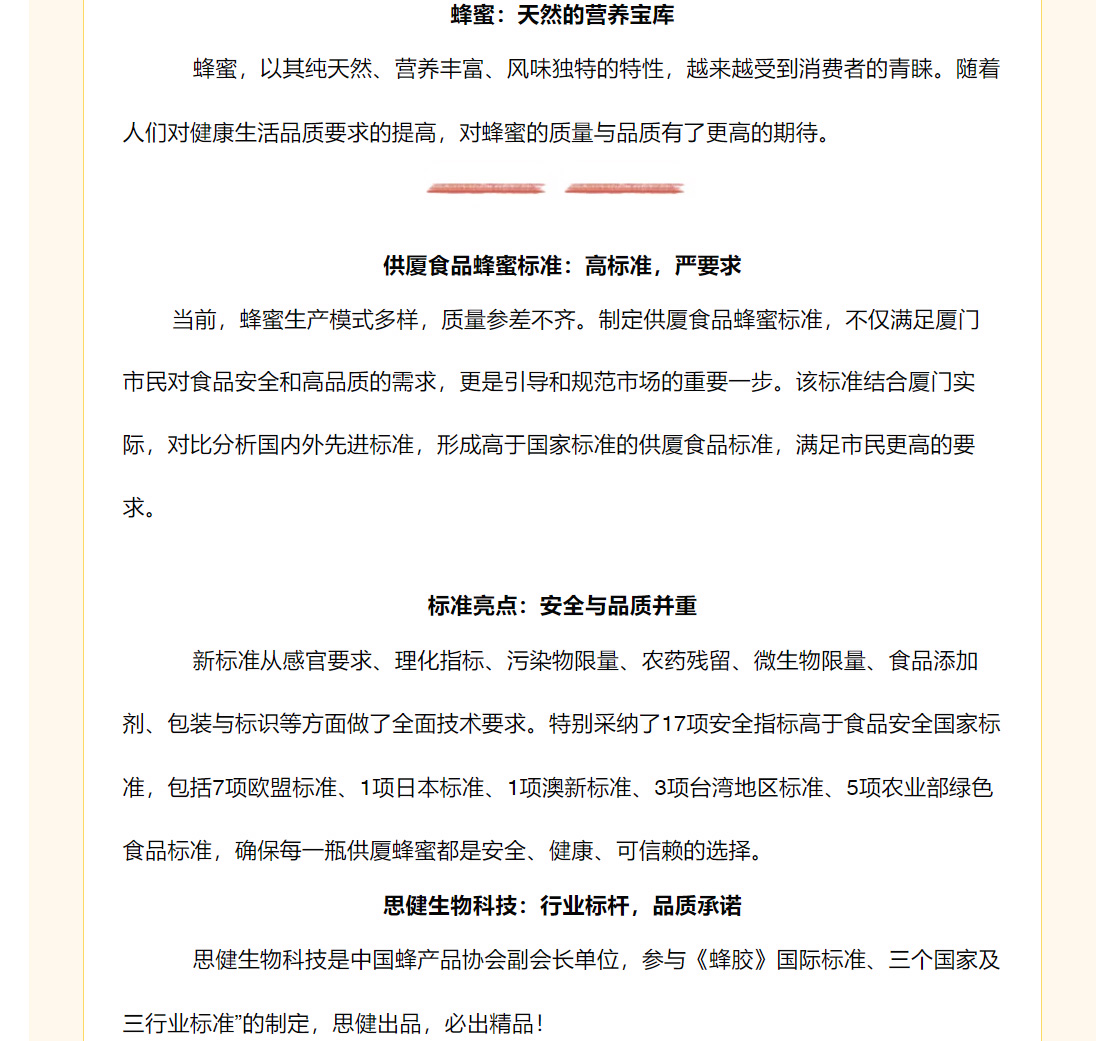 快訊:供廈標(biāo)準(zhǔn)《供廈食品 蜂蜜》 2024-9-30發(fā)布實施 思健生物科技很榮幸參與該標(biāo)準(zhǔn)制定